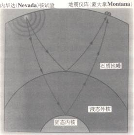 说起地震,大家都觉得很可怕。一次大的地震,地动山摇,房屋倒塌,人畜伤亡,有时几分钟之内就能毁灭一座城市。但是地震波也是弹性波,从本质上来讲和超声探伤时在钢块中传播的超声波是一回事,只不过地震波的频率特别低,振幅特别大而已。地壳由一些巨大的岩石板块组成,这些板块总在缓慢移动,有时板块边缘互相挤迫不能移动,一旦突然滑动,就会使大地猛烈震动。弹性波由震中传出,受地核阻挡,有相当大的范围地震波传不到。(图4)在地下核爆炸实验时,弹性波在液态外核和固态内核的边界上反射。准确测量反射波到达的时间,就可以知道内核和外核的尺寸。地震波成了测量地球内部结构的工具。(图5)