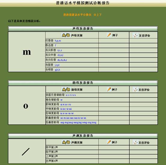 该技术可用于帮助学习语言的用户找出他(她)发音中不准确的地方,包括:语音检测模块、发音准确度分析评估模块、音调分析识别模块(用于汉语)、时长分析评估模块、能量分析评估模块以及综合评估模块。对于所提供的学习材料(字、词或句子),不仅评估学习者总体上的发音准确度,而且能够给出学习者对于每句话、每个词甚至每个音素的得分,同时指出学习者发音不足的位置和方面,并提出改进的意见。