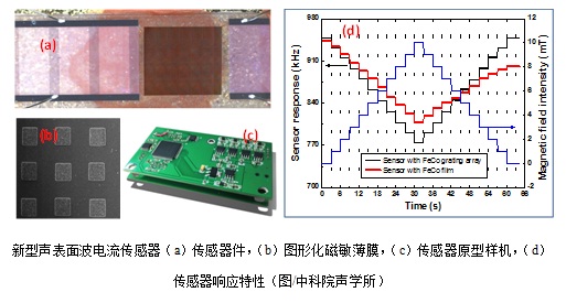 王文课题组通过建立声表面波磁致伸缩效应的电流感知理论,实现了对沉积图形化磁致伸缩薄膜的新型声表面波电流传感器的物理结构优化,提取了获得高磁敏、快速响应与低磁滞的拓扑结构参数;给出了传感器微纳制作工艺方法,研制出了原型器件,测试结果很好的验证了分析理论,其灵敏度达到了22kHz/A,分辨率可达0.1mA以下,并体现出良好的线性度。相对于现有技术,声表面波电流传感器表现出了微小型化、抗干扰能力强、线性度好、低功耗等优势,在智能电网线路检测、电力冶金与轨道交通中的供电安全预警与救援、工业自动化中的电源继电保护中极具应用前景。