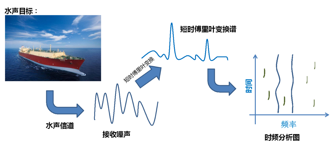 时频分析是一种有效的水声信号分析方法。其原理基于短时傅里叶变换(Short-Time Fourier Transform, STFT),即按照一定的时间间隔截取长度相等的接收信号,然后对每段信号进行傅里叶变换,得到不同时刻的信号功率谱。将这些功率谱沿时间轴进行排列,就形成了时频分析图。这种分析结果同时含有时间、频率和调制三种特征信息,是一种典型的多模态融合特征,具有更高的可区分度,有助于提升水声目标识别技术的性能。