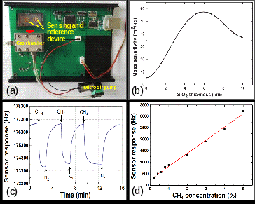 研究人员采用双通道差分振荡结构,并将对甲烷具有特异选择性的穴番-A(cryptophane-A)气敏薄膜沉积于乐甫波器件的声传播路径表面,利用气敏薄膜对甲烷的特异性吸附,引起声波传播速度的变化,进而引起差分振荡频率的相应改变,据此来评价待测甲烷气体。