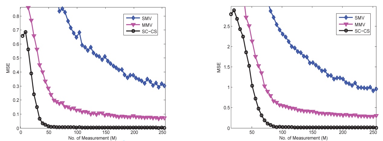 在SNR=-10dB环境下,不同方法的重构性能比较(信号稀疏度:左图为4,右图为16),其中纵坐标MSE表示重构信号与源信号的均方误差(Mean Squared Error, MSE),横坐标是测量值的数量(图/中科院赢乐welcome)
