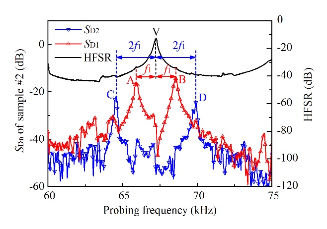在应用中,最佳高频频率的选择问题一直未得到很好解决。研究人员以含不同位置裂纹的铝杆为实验对象,测量不同高频频率下接收信号中的调制强度。实验发现,调制强度受到裂纹位置影响,当裂纹位于铝杆某个纵向共振节点,在n(共振频率阶数)倍共振频率附近的调制强度(包括峰值和谷值)大大降低(图2)。调制强度峰值出现在铝杆共振频率两侧,其间隔为低频激励频率(图3)。