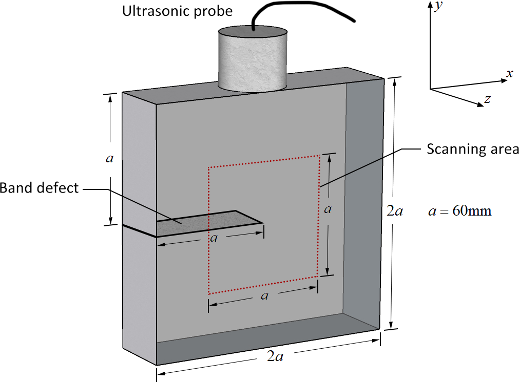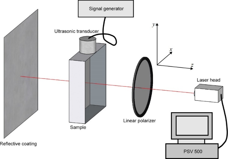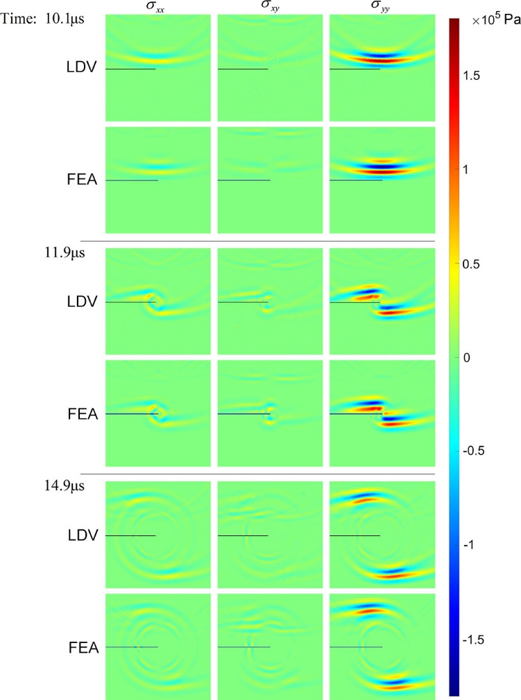 研究人员用一个具有带状缺陷的K9光学玻璃块进行测试。由超声换能器激发的纵波从玻璃块顶端向下传播,并被带状缺陷散射。LDV记录下了各个时刻的弹性波图像,包括三个独立的应力分量。有限元仿真(Finite element analysis, FEA)结果验证了这种新型的测量方法。