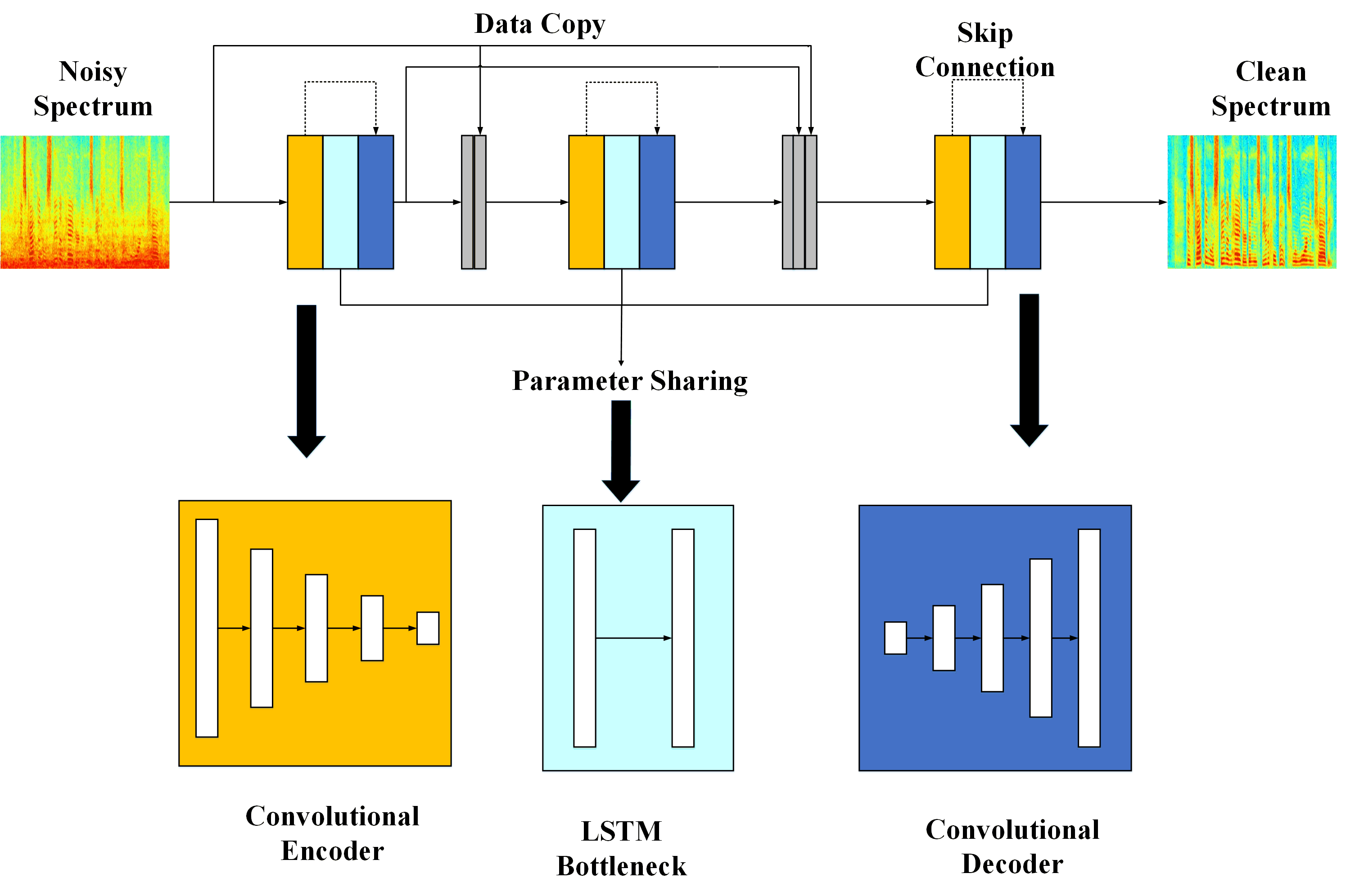 研究人员在卷积循环神经网络基础上将增强过程分解为多个子阶段,在每个子阶段中进行轻量级模块建模并提升一部分语音的信噪比,从而在后续阶段中能够把之前阶段的输出作为先验信息,逐步提升后续处理结果。同时通过在不同阶段复用LSTM (Long and Short-Term Memory)模块的方式大幅度减小参数量。