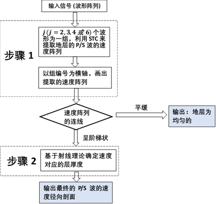 不同于同时反演速度和径向位置两个参数的传统方法,本研究的分步反演过程分为两个步骤进行:首先通过对声波阵列的相邻接收器依次采用STC(Slowness Time Coherence)方法提取速度阵列,然后基于射线理论获得对应速度的层厚(即径向分布)。步骤1的反演结果可以用于指导操作并确定步骤2是否有必要进行。
