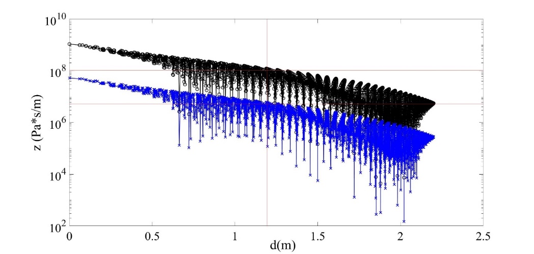 图2 弹性球壳的全局声阻抗矩阵幅值随距离变化曲线:黑线是100Hz结果,蓝线是2000Hz结果(图/中科院赢乐welcome)