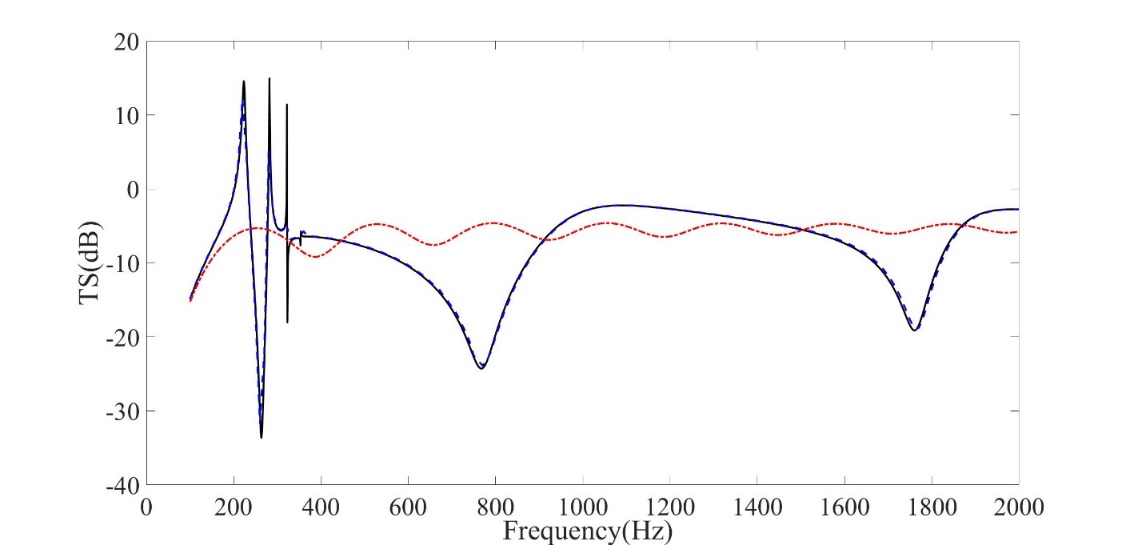 图3 平面波入射下水中弹性球壳的TS值:黑色实线为级数解;蓝色虚线为本文数值解;红色细点画线为硬壁球壳解(图/中科院赢乐welcome)
