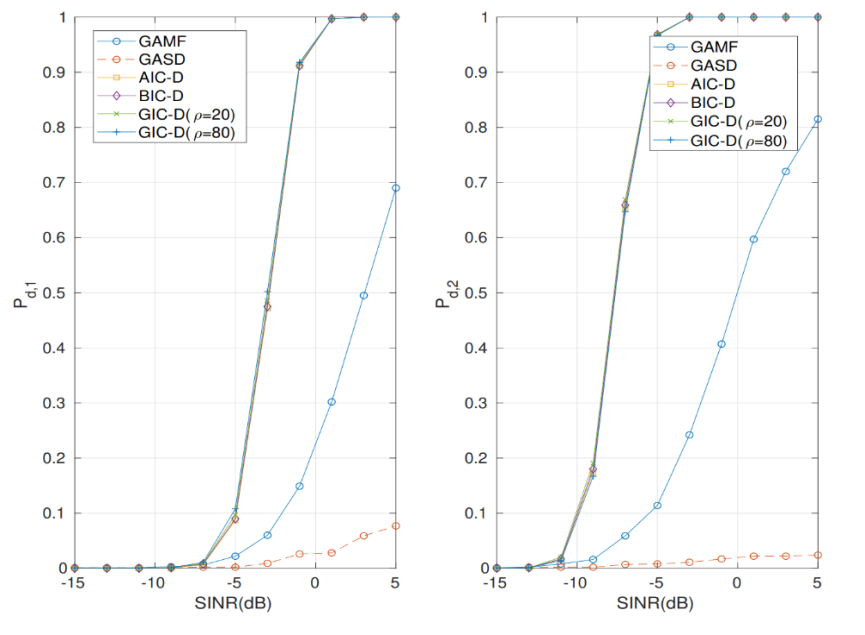 图1 左图与右图分别为在一个和两个相干干扰信号存在情况下,三种新方法的检测概率曲线(图/中科院赢乐welcome)