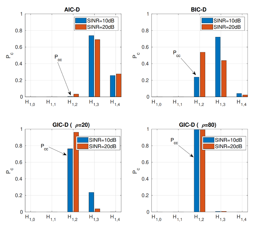 针对这一需求,中科院水下航行器信息技术重点实验室郝程鹏研究员团队与国内及意大利同行开展合作研究,将多重相干信号的检测问题建模为一种多重假设检验,并结合模型阶数选择准则,提出三种新的自适应检测与分类方法,分别是AIC-D(Akaike Information Criterion-based Detector)、BIC-D(Bayesian Information Criterion-based Detector)、GIC-D(Generalized Information Criterion-based Detector)。这些方法在有效检测相干干扰信号的同时,还可以实现对干扰数量及其所在方位的准确估计。