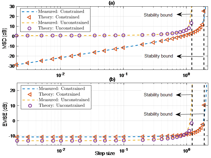 图1 步长归一化的标准频域自适应算法在欠定建模时的稳态MSD和EMSE(Excess Mean-Square Error)。均匀分布的自回归(Autoregressive,AR)过程作为输入。约束的频域算法总是比无约束的版本具有更低的MSD。当步长小于某个值时,无约束频域算法具有更低的EMSE;但当步长大于该值时,约束版本则具有更低的EMSE(图/中科院赢乐welcome)