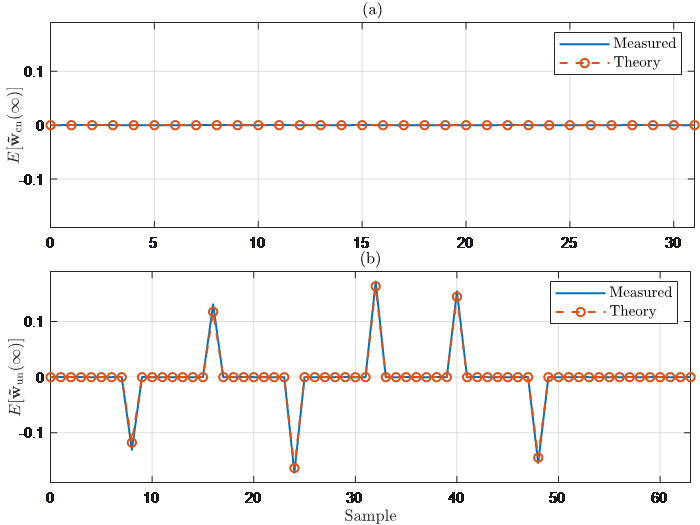 欠定频域自适应滤波算法收敛性能分析:当自适应滤波器阶数小于实际系统的阶数时,无约束的频域算法收敛到无约束的维纳解,而约束的版本则不能,这使得无约束算法比约束算法具有更低的最小MSE(Mean-Square Error)。科研人员也证实均值最优并不一定带来MSE最优,这纠正了先前一些研究成果中的错误结论,并强调了MSD(Mean-Square Deviation)和MSE两个技术指标不一定正相关。该研究成果先后2019年6月和10月在线发表于 IEEE Transactions on Circuits and Systems I: Regular Papers 和 Signal Processing 。
