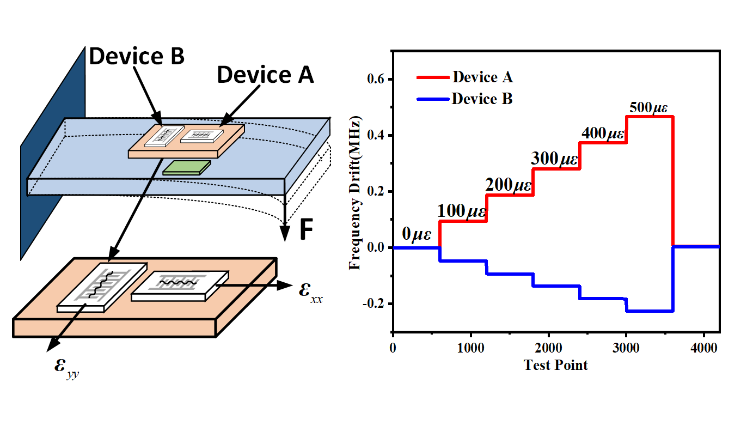 在无线无源传感实验(无线传感距离为1米)中,获得了1.3kHz/με的高应变灵敏度和±0.7με的测量分辨率,并在20~120℃范围内实现了极高的温度稳定性,将传统单一芯片结构温度系数从~20ppm/℃降至~0.1ppm/℃,该项研究成果推进了声表面波应变传感技术的实用化进程。