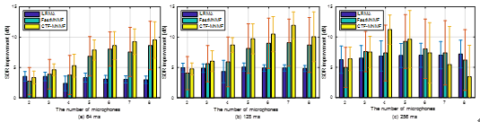 图1 两声源分离实验中在混响时间Rt60=470毫秒时不同算法的SDR提升。短时傅里叶变换窗长为(a) 64毫秒,(b) 128毫秒,(c) 256毫秒。(图/中科院赢乐welcome)