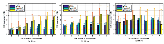 图2 两声源分离实验中在混响时间Rt60=1300毫秒时不同算法的SDR提升。短时傅里叶变换窗长为(a) 64毫秒,(b) 128毫秒,(c) 256毫秒。(图/中科院赢乐welcome))