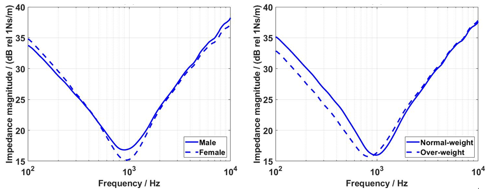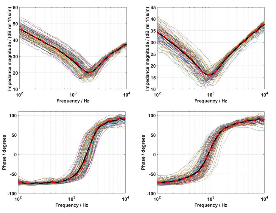 实验结果表明,同一位受试者的乳突阻抗和髁突阻抗之间有显著差异,同一激励位置的力阻抗在共振频率以下的阻抗值存在明显的个体间差异(图2)。统计分析结果表明乳突阻抗会受到年龄影响(图3),和性别、胖瘦无关;髁突阻抗主要是受到胖瘦影响,其次受性别影响(图4),和年龄无关。对比结果表明中国人的乳突力阻抗和与标准人工乳突B&K 4930 以及西方人的乳突力阻抗均存在明显的差异(图5)。电力类比模型仿真预测结果表明乳突和髁突之间的阻抗差异会引起骨传导器件在激励位置的输出力存在显著差异(图6)。因此用现有的国际标准IEC-373来测量消费电子类骨导耳机的输出性能会存在较大偏差。该论文研究可以指导研制适合中国人群的乳突和髁突力阻抗模拟器,用于测量和校准骨传导器件的输出性能。研究人员为探究适配中国人群的骨传导器件校准监测优化做出基础贡献。