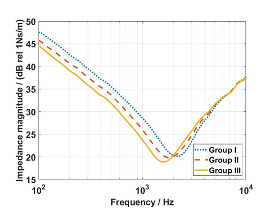 图 3 乳突力阻抗和年龄之间的关系(Group I表示22-29岁的受试者;Group II表示32-50岁的受试者;Group III表示52-67岁的受试者)。(图/中科院赢乐welcome)