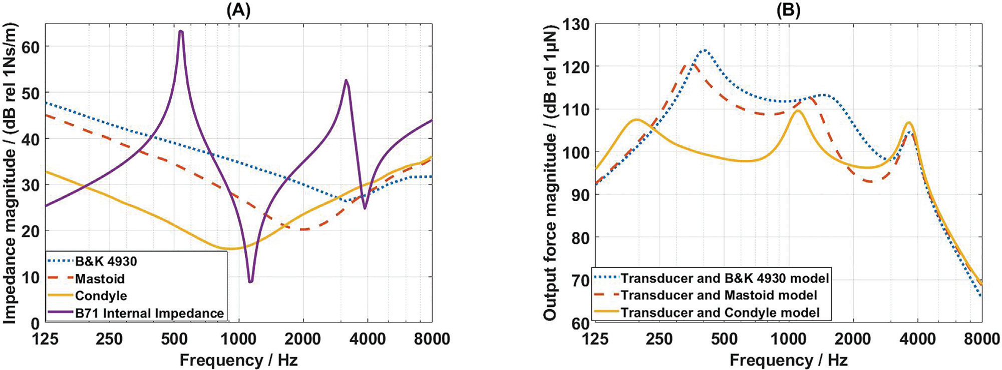 图6 (A)实际测量的乳突力阻抗、髁突力阻抗、以及人工乳突模拟器B&K 4930的力阻抗。(B)骨传导器件电力类比模型耦合人工乳突模拟器B&K 4930力阻抗、乳突力阻抗和髁突力阻抗时的输出力。(图/中科院赢乐welcome)