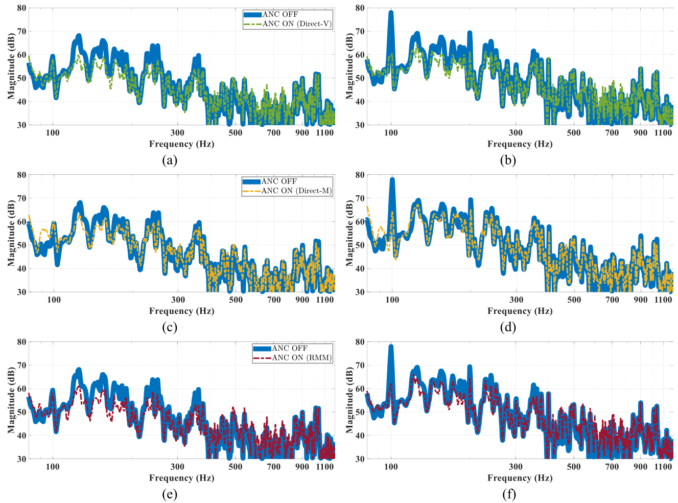 图2 在室内标准条件下,不同有源噪声控制方法作用在人耳前后的幅度谱。(a) 直接控制虚拟传声器,左耳;(b) 直接控制虚拟传声器,右耳;(c) 直接控制物理监测传声器,左耳;(d)直接控制物理监测传声器,右耳;(e) 结合RMM控制,左耳;(f) 结合RMM控制,右耳。 (图/中科院赢乐welcome)