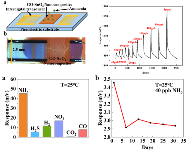 研究人员利用氧化石墨烯-氧化锡纳米复合材料制备于声传播路径表面,构建出了小尺度声表面波氨气传感器。他们结合鉴相传感电路,对所研制的声表面波氨气传感器进行实验测试,结果表明相对于国内外已报道氨气传感器,该传感器实现了低检测限(40ppb)、高灵敏度(0.098 mV/ppb)以及快速的传感响应(<16.4 s),此外还具有良好选择性和重复性的特点,在痕量氨气的检测中具有很好的应用前景。
