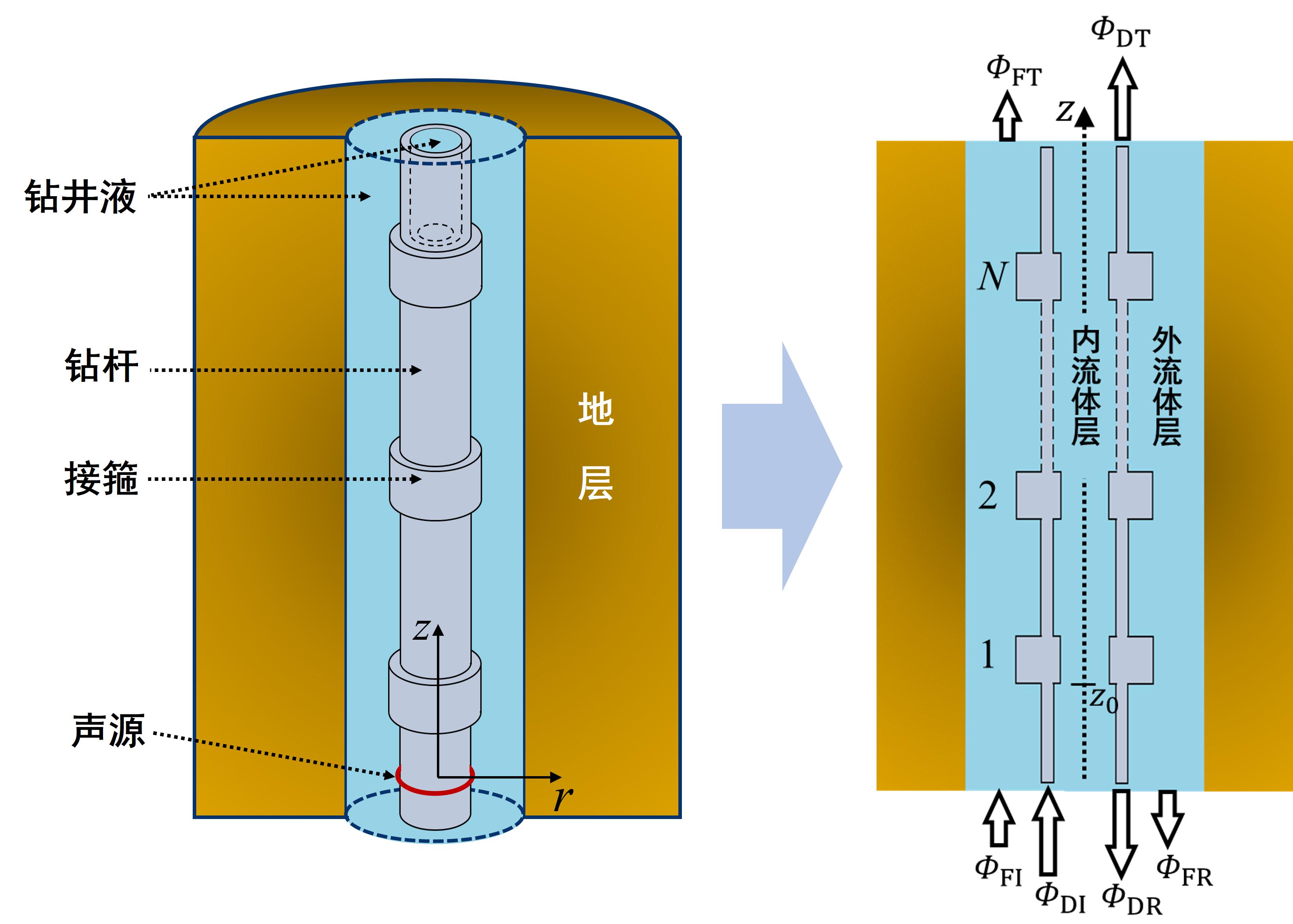 目前,把随钻声波测井从“声速测量”提升为“智能导钻”的最大瓶颈是井下数据的通讯速率太低,无法实现实时、有效的地层评价。用钻柱导波作为载体开展数据遥传是一项新颖的设想,具有部署成本低、信道容量大和场景适应性广等潜在优势,近年来受到国际石油工业界的关注。而实现该技术应用的关键是掌握周期结构导波在充液井孔中的传播特性。