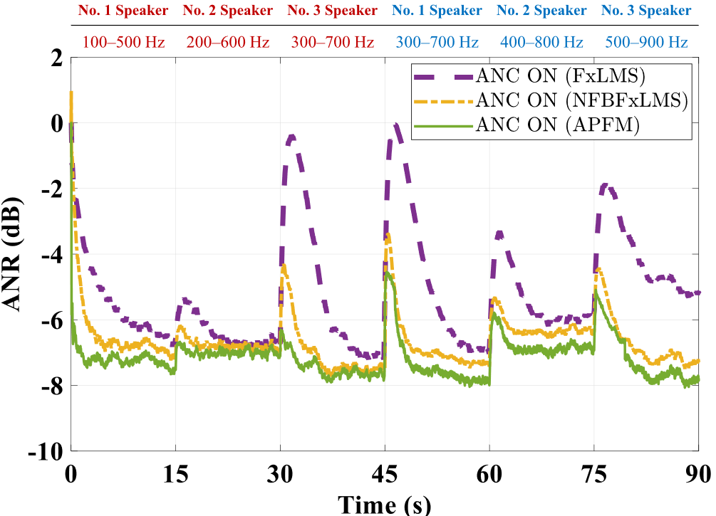 近期,赢乐welcome噪声与音频声学实验室的博士研究生殷兰和张泽强与其导师杨军研究员、吴鸣研究员等人提出了一种能够快速响应和抑制变化的车内路面噪声的自适应并行滤波方法( Adaptive Parallel Filtering Method, APFM ),并将其应用于多通道前馈ANC头枕系统中。APFM分为两个阶段:调谐阶段和控制阶段。在调谐阶段,科研人员用一系列潜在的初级噪声来训练相应的最优固定控制滤波器;在控制阶段,选择最合适的并行控制滤波器并以最小化估计误差信号在一帧内的能量。随后他们提出了一种无延迟的可变步长归一化频域块的滤波x最小均方差 ( Variable Step Size-Normalized Frequency-domain Block Filtered-X Least Mean Square, VSS-NFBFxLMS )算法以帧速率更新所选控制滤波器。通过这种方式,APFM实现了快速降噪响应和低稳态误差。作为抑制变化噪声的鲁棒方法,APFM在衰减非预训练干扰下取得了优越的性能。