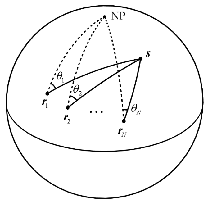 声源的波达角度(Angle Of Arrivals, AOA) 定位问题实际是球面AOA的定位问题。球面AOA定位问题的传统解决方法主要包括球面三角定位法 (Spherical Triangulation, ST) 和最大似然估计器 (Maximum Likelihood Estimator, MLE)。ST算法通过计算球面示向线的交点来估计两个台站情况下的信源位置,是一种简单直观的方法,但是对于多台站的情况定位性能较差。MLE算法是最常用的球面AOA定位方法,受限于其迭代求解的特性,算法往往具有较高的计算复杂度。同时MLE算法需要谨慎选择初始估计,初值选择不慎易导致算法无法收敛。