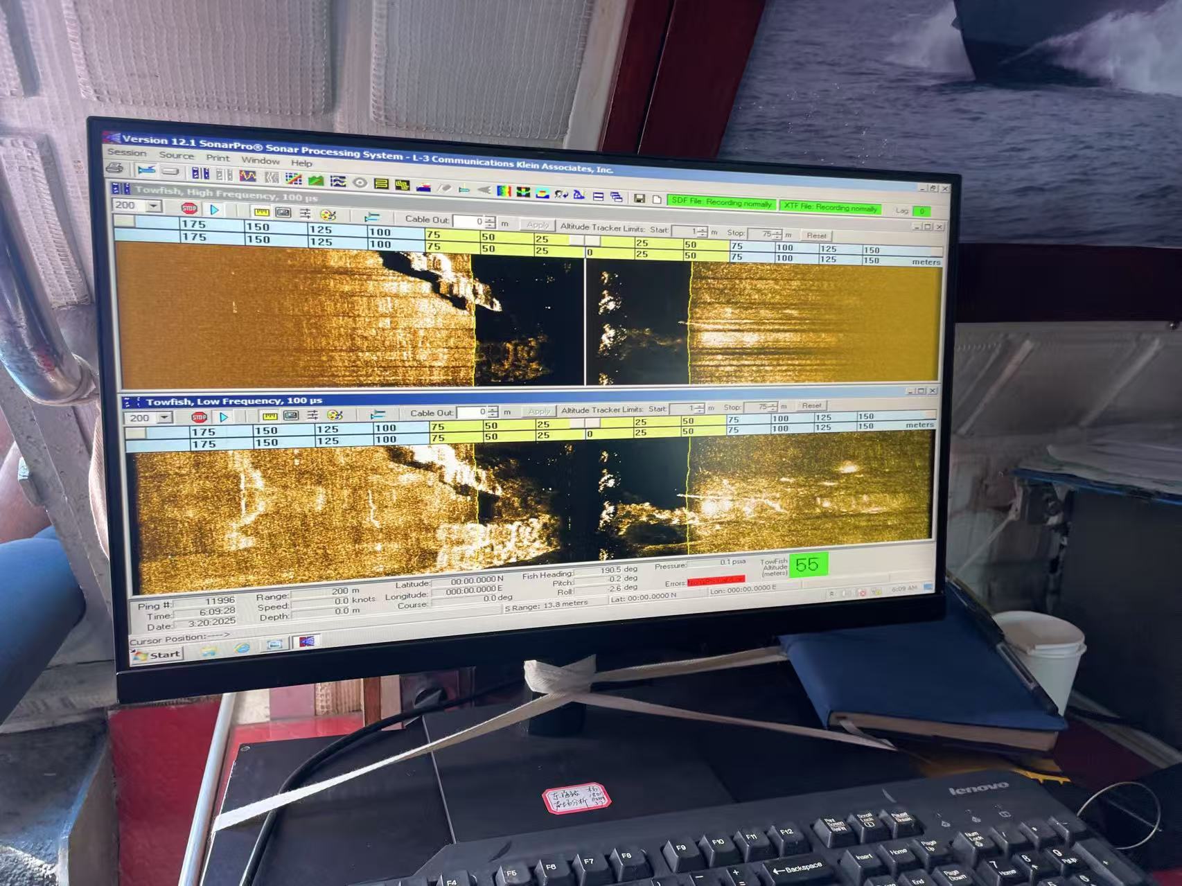 试验当天,他们按照规划好的十字交叉侧扫航路,先从北向南进行扫测,然后又从东向西进行扫测,获得了不同方位的沉船声图,从而确定了沉船的位置。