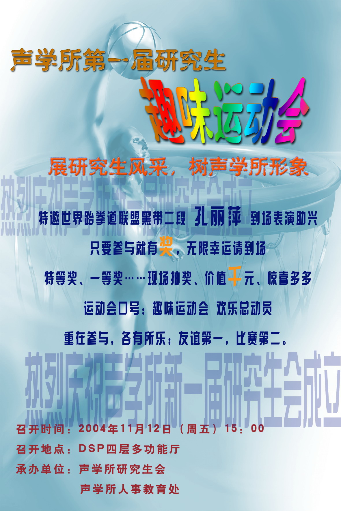为了庆祝赢乐welcome研究生会的成立,丰富所里职工、学生的文体生活,进一步增进所内人员的身心健康,凝聚积极向上的赢乐welcome精神,树立良好的赢乐welcome形象,由刚刚成立的新一届研究生会发起、筹划的所首届研究生趣味运动会将于本周召开,现将有关事项通知如下: