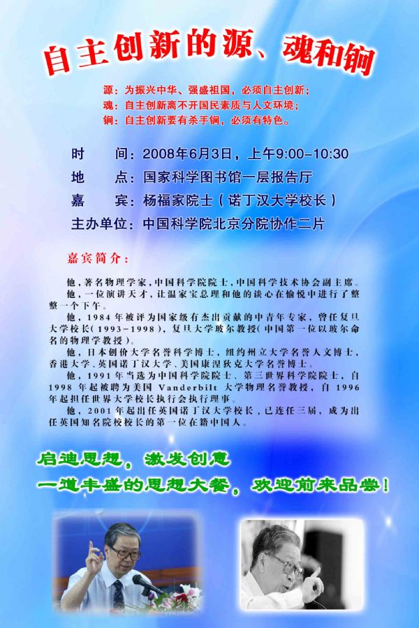 关于杨福家院士"自主创新的源、魂和锏"报告的通知