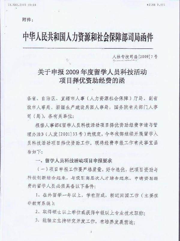 根据人力资源和社会保障部《关于申报2009年度留学人员科技活动项目择优资助经费的函》(人社专技司函[2009]7号)文件精神,人事教育处将组织申报工作,详细内容见所网通知公告栏。