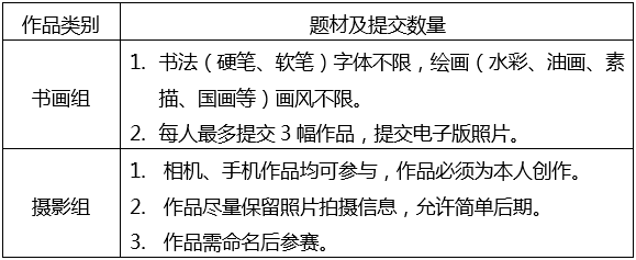 4.书画组和摄影组分别评比,每个参赛者可同时投稿摄影和书画作品。摄影/书画组有多幅作品获奖时,以得分高的作品评奖。