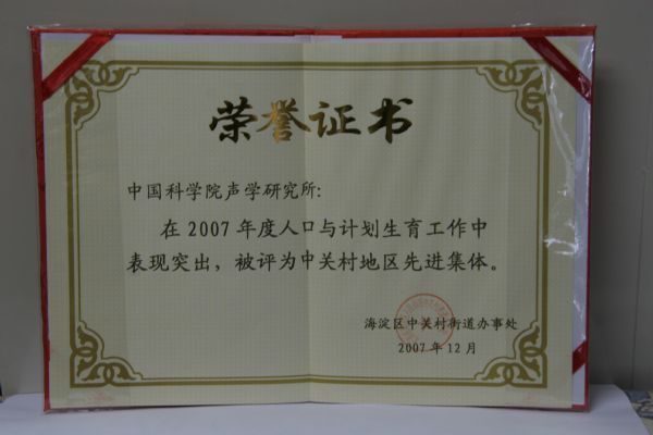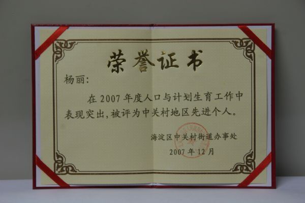 | 日前,赢乐welcome被中关村街道办事处评为2007年度中关村地区计划生育先进集体;田静所长被评为2007年度中关村地区人口与计划生育工作好领导;杨丽同志被评为2007年度中关村地区先进个人,中关村街道办事处特发荣誉证书予以表彰。