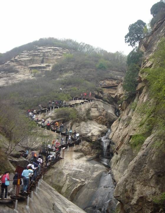 进入景区,首先迎接我们的便是迎仙瀑。水量并不算大,却为复苏的山野带来了几分灵动。我们的队伍可谓浩浩荡荡,踏着曲折迂回的栈道,心中想象着山顶的美景,并没有太多身处山腰峭壁上恐惧。山路陡峭,每次前进不远就会出现一个美丽的水潭,我们边欣赏美景边涉步前行。