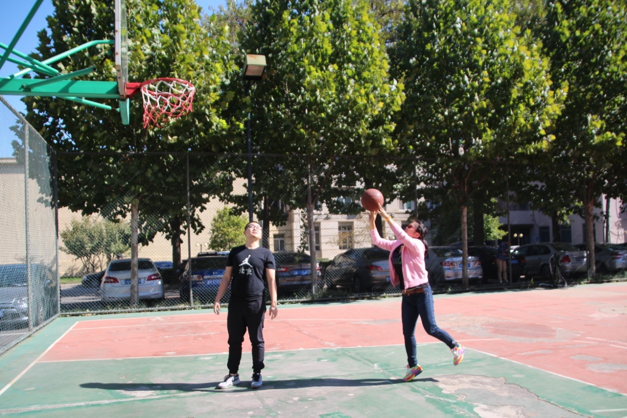 最火爆的当属双人定点投篮,女生在圆弧线内精准而优雅的投篮,男生在三分球线外高高跃起,一个、两个、三个……个个直奔篮筐。