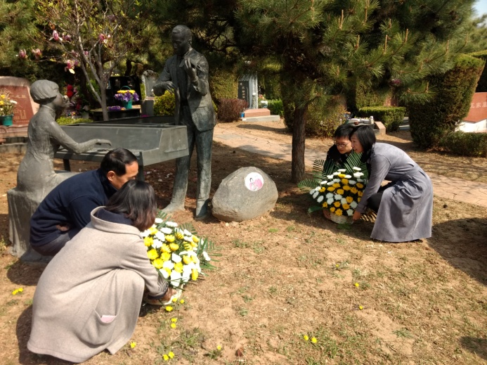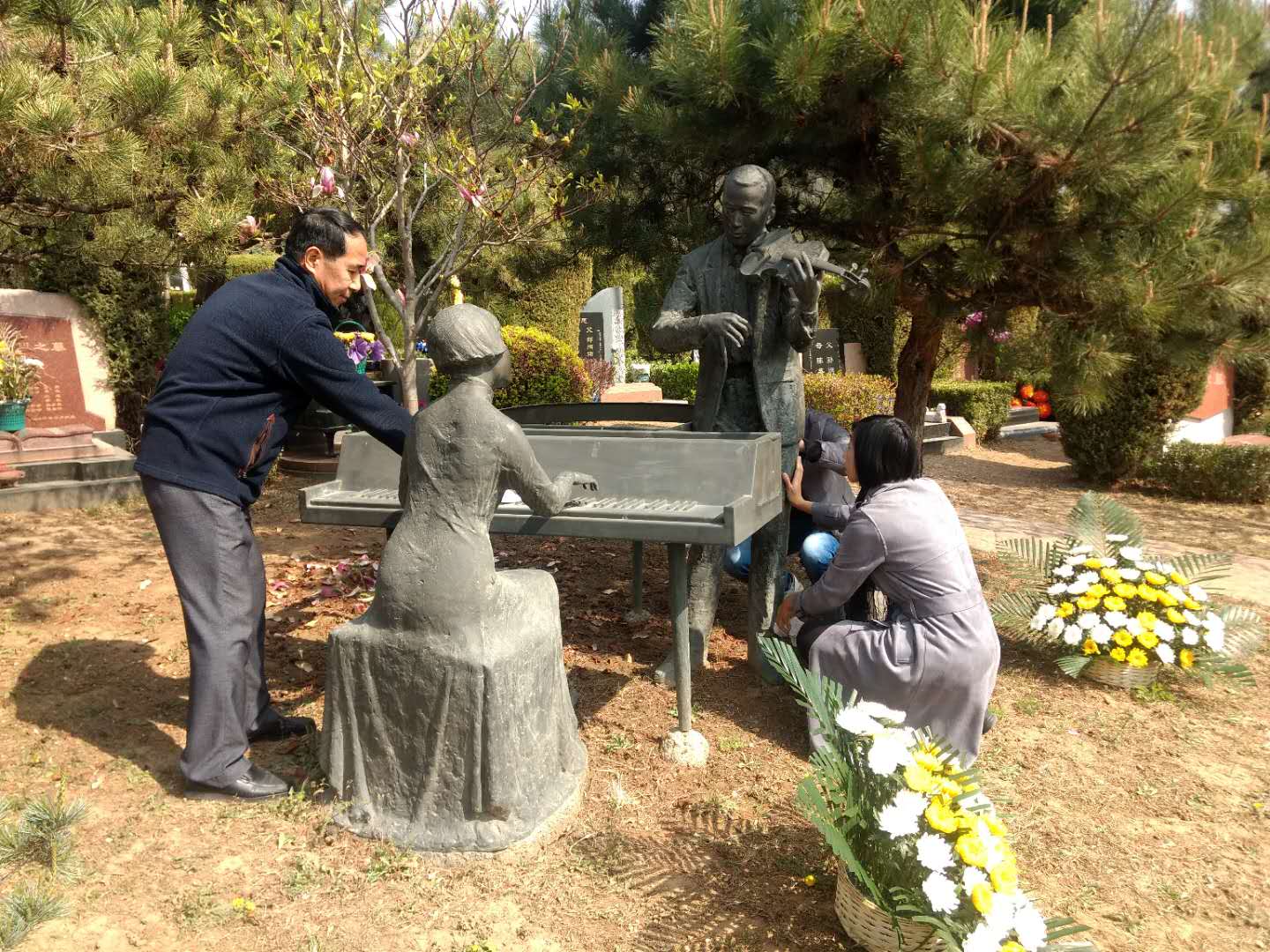 在陵园门口,大家自动排成两纵队,一同前往汪德昭先生的陵墓。汪先生和其夫人李惠年先生的墓前伫立着一组铜像,李先生优雅地弹着钢琴,汪先生陶醉地拉着小提琴,仿佛可以看到流淌在二人之间的音符和浪漫情谊。轻风拂过,碑碣无声,祭扫代表在碑前献上两束花篮,并集体向汪先生和李先生三鞠躬,表达对两位前辈的崇敬和悼念之情。