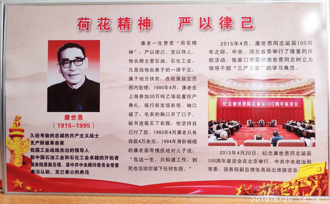 怀安县西湾堡乡是我国无产阶级革命家、工业战线杰出的领导人康世恩同志的故乡,大家在这里学习了康老一生赞赏的荷花精神,共同学习康老艰苦奋斗、开拓创新的革命精神,始终保持同人民群众的血肉联系的工作作风和艰苦朴素、廉洁奉公的优良品质。康老严以律己、宽以待人,他长期主管石油、石化工业,凡是找他批条子的一律不见;属于地方扶贫的,在政策规定范围内处理。2015年4月,张家口市委把康老树立为领导干部“三严三实”的学习典范。