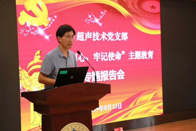 2019年8月13日,超声技术党支部在DSP四楼多功能厅召开“不忘初心、牢记使命”主题教育专题报告会。所党委副书记、纪委书记李浩然应邀为支部党员讲题为“全面从严治党新形势下做忠诚干净担当的科学家党员”的党课,所党委委员王小民所长、王秀明主任等50余名支部党员参加了会议。会议由支部书记陈德华主持。