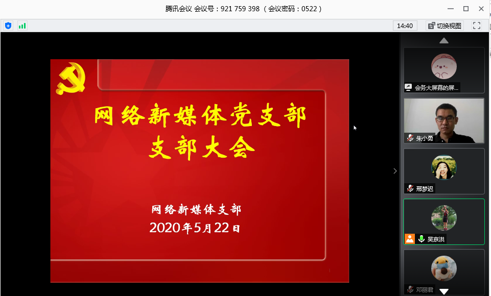 2020522日上午,网络新媒体党支部召开支部党员大会,本次会议采用网络会议的形式线上召开,总计36位同志参加。会议由支部副书记吴京洪主持。