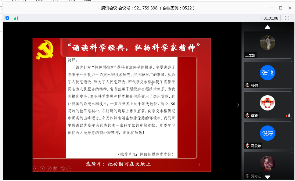 吴京洪带领大家就“诵读科学经典,弘扬科学精神”进行了专题讨论,诵读了“共和国勋章”获得者屠呦呦和袁隆平的科学事迹,多位党员在会上积极踊跃,围绕屠呦呦和袁隆平的先进事迹进行发言,分享了各自的心得感想。其中,就屠呦呦的先进事迹,康立毅同志表示应该学习老一辈科学家的坚守与实干精神,做到不跟风,潜心钻研,在科研工作中发挥团队精神,取长补短;徐晓明同志结合当下疫情,致敬了奋战在抗疫前线的医务工作者,并表示要学习老一辈的科学精神,从自身做起,听从学校安排,服务社会大众;王可同志强调了身体健康是革命的本钱,作为科研工作者,要注重身体健康,要富有社会责任感。