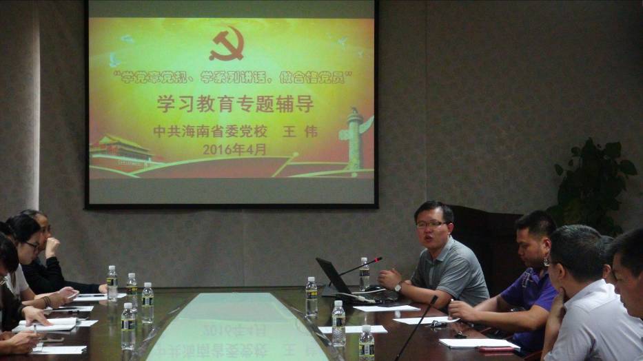 本次会议邀请了海南省委党校王伟教授作《解读“两学一做”》的宣讲报告。王伟教授根据党章和中共中央办公厅2016年印发的《关于在全体党员中开展“学党章党规、学系列讲话、做合格党员”学习教育方案》结合当前形势,对两学一做进行全面详实的讲解,语言字字珠玑,观点引经据典,分析鞭辟入里,得到大家的一致认同。