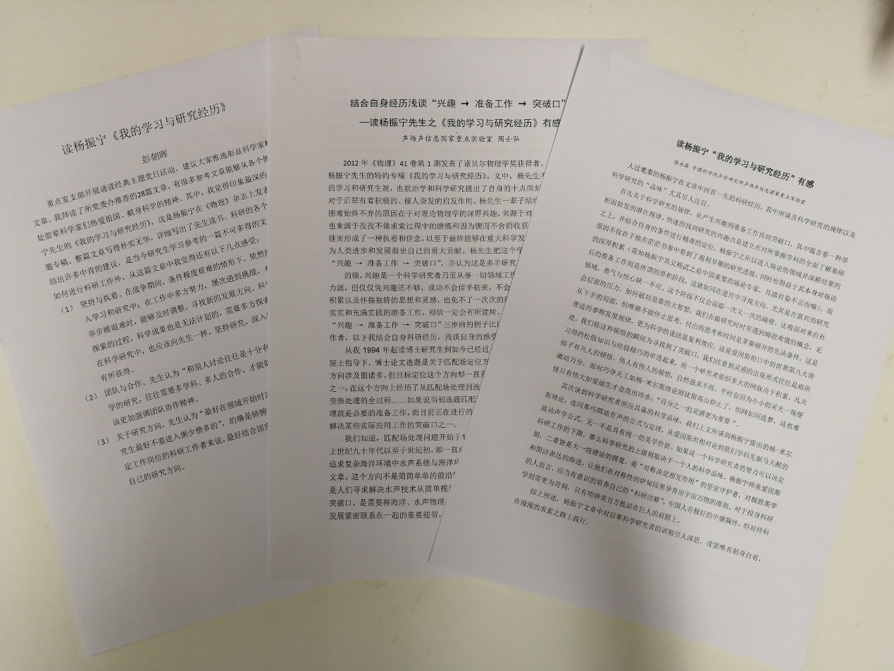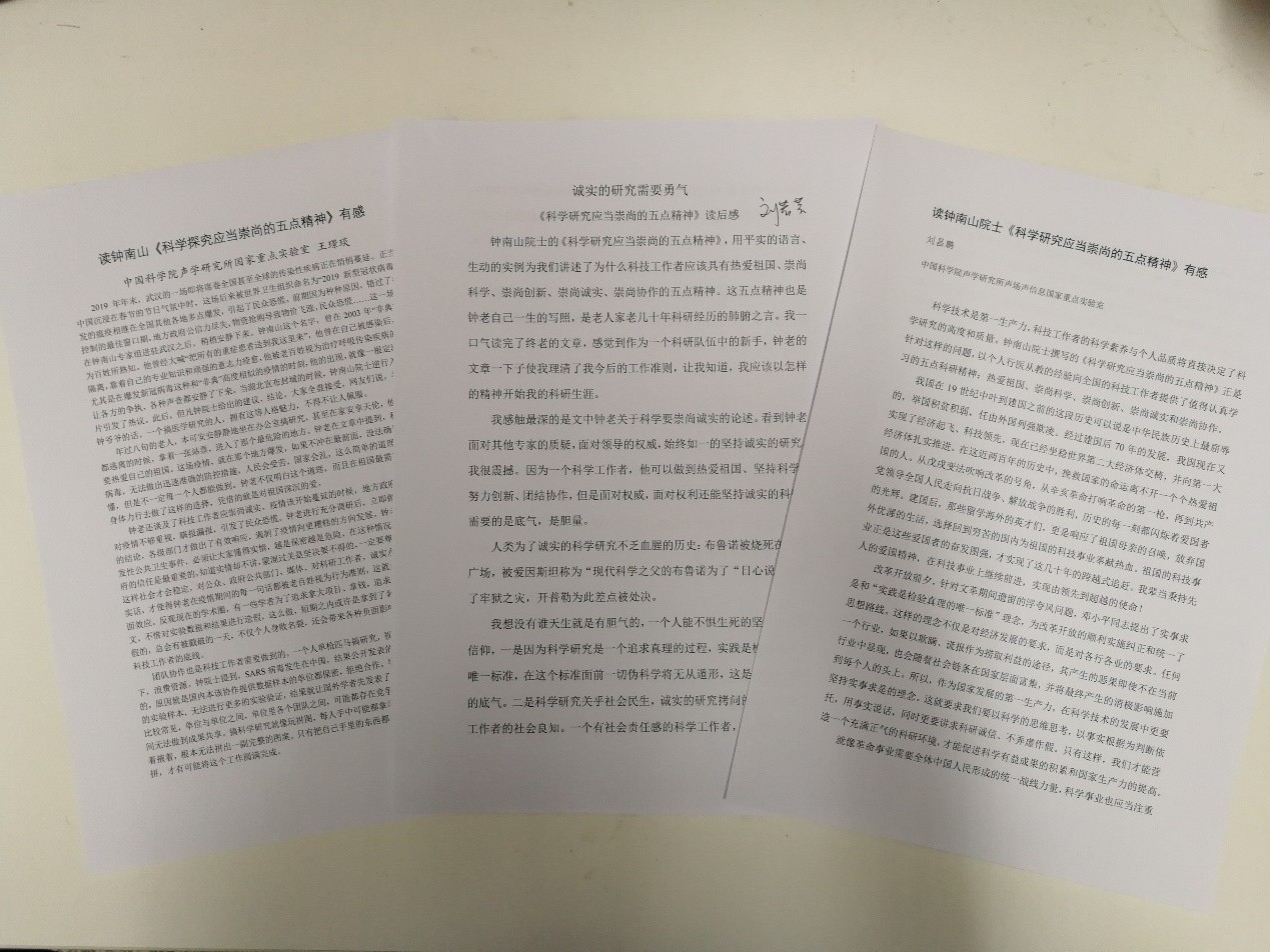 根据所党委下发的“诵读科学经典、弘扬科学精神”主题党日相关工作部署,重点室党支部通过微信群和支委会讨论,推荐了杨振宁院士的《我的学习与研究经历》和钟南山院士的《科学研究应当崇尚的五点精神》两篇文章,“五一”期间供支部党员学习。大家读后触动颇深,纷纷发表感想,截至目前,共收到读后感47份。