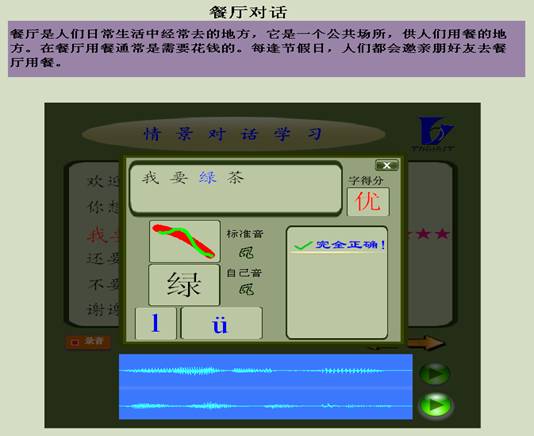 该技术可用于帮助学习语言的用户找出他(她)发音中不准确的地方,包括:语音检测模块、发音准确度分析评估模块、音调分析识别模块(用于汉语)、时长分析评估模块、能量分析评估模块以及综合评估模块。对于所提供的学习材料(字、词或句子),不仅评估学习者总体上的发音准确度,而且能够给出学习者对于每句话、每个词甚至每个音素的得分,同时指出学习者发音不足的位置和方面,并提出改进的意见。