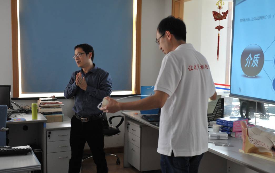 在工业超声研究室,科学导师张世功博士为来访公众上了题为“神秘的超声世界”科普讲座,观看了由上海科教电影制片厂拍摄,我站牵头的“声音科学”科教宣传片,并在志愿者的带领下,让“小小科学家”们逐一体验了十余项声学互动实验,孩子们带着灿烂的笑容留下了美好的“声学记忆”。