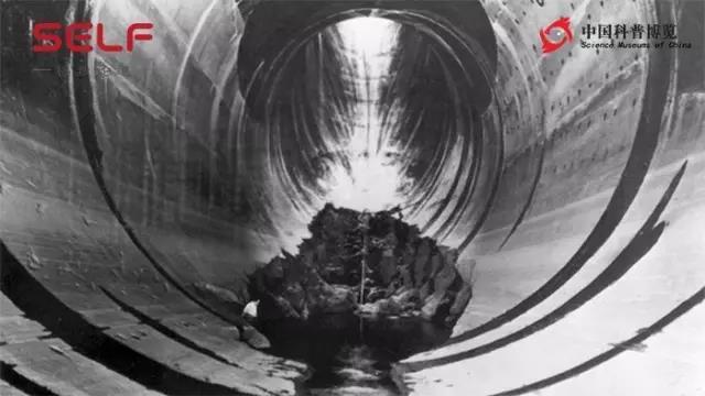 这是一座水坝,水坝要蓄水但是水坝也要泄洪,这是一个泄洪洞,大家看泄洪洞前面有一个巨大的一个蚀坑,我们把镜头拉远一点大家注意那个白点──那是一个人,所以这个洞是非常的大,这个蚀坑也非常的大,这个蚀坑就是这些小泡泡的一个杰作。