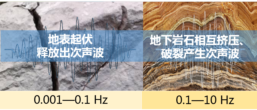 不同类型的地质活动会产生不同频率范围的次声波。地下岩石相互挤压、破裂,产生的次声波频率偏高,大于0.1Hz。地表起伏释放出的次声波频率偏低,为0.001—0.1Hz。