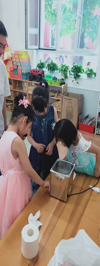 经过培训,小讲解员们能够逐一介绍超声导盲仪、超声清洗机和超声雾化换能器的工作原理和实验现象。通过这些小实验,小朋友们对超声频率、超声功率等抽象的技术名词有了形象的认识,更对超声留下了深刻的印象。