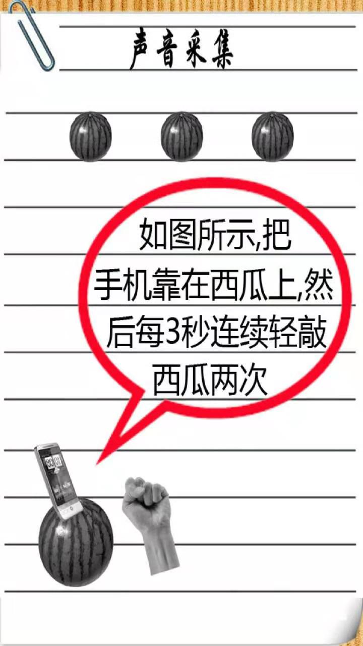 我们先来测评市面上一款名为“听西瓜”的APP。将手机靠在西瓜上,敲击西瓜,分析手机收集的声音信号,它的判断依据有两种: