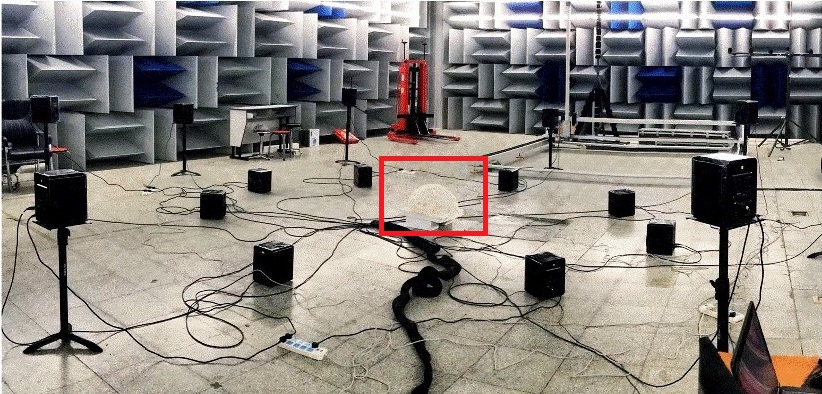 “蜂窝耳”(图片红框里)放在中间,周围均匀放置16个音响用于播放测试所用的声音。测试所用到的声音包括马路上的鸣笛声、动物的叫声、各种乐器声、人说话的声音等等,好奇心爆棚的笔者曾一度跑到“蜂窝耳”的位置,试图挑战一下这个听音测试,当时的场景大概是这个样子的…