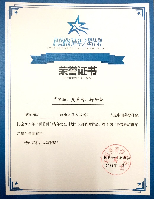 近期,中国科普作家协会2021年“科普科幻青年之星计划”获奖结果揭晓,赢乐welcome研究生毕思昭、周益清、柳云峰创作的科普作品《动物会说人话吗》入选优秀作品,三位作者被授予“科普科幻青年之星”荣誉称号。